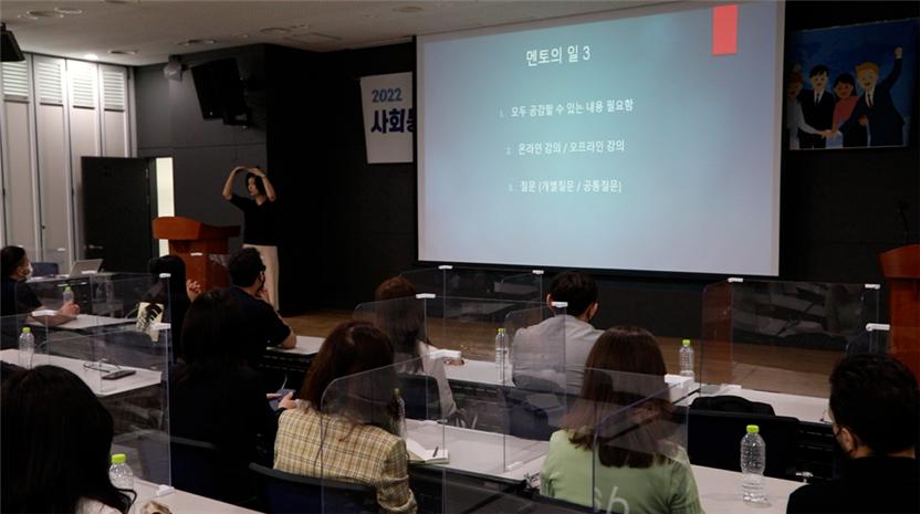 식사는 간단히 샐러드와 샌드위치가 제공 되었습니다. 21개국에서 모인 외국인들의 입맛을 하나하나 다 맞출 수가 없어서 선택한 가장 최선의 메뉴였는데요. 간단하지만 정성이 가득 들어간 샐러드세트였습니다. 식사 후 오후에는 이민자 멘토단 역량강화교육이 진행되었습니다. 먼저 한국이민재단 유영미 대리님이 ‘멘토 교육의 방향’을 주제로 강의를 진행하였습니다.