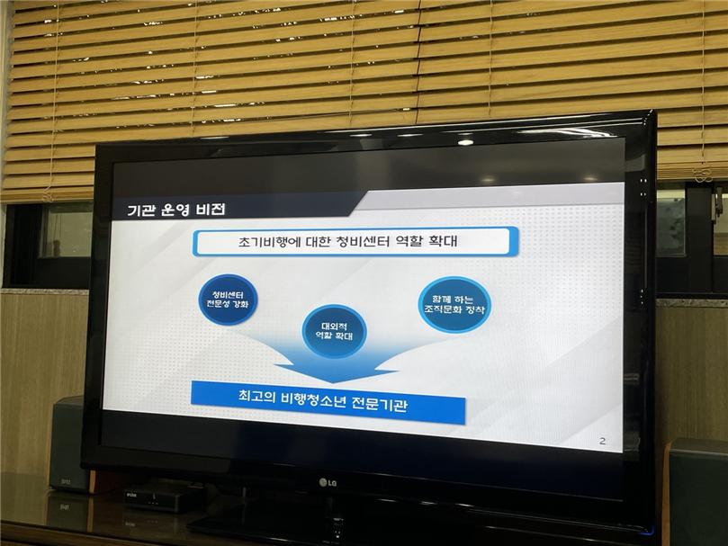 자리에 앉은 후 손성진 센터장님께서 준비해주신 PPT 화면을 보며 서울북부청소년꿈키움센터에 대한 설명을 들었습니다. 이곳에서 어떤 교육 프로그램들이 진행되고 있는지, 보다 효과적인 비행청소년 지도를 위해 무슨 노력을 기울이고 있는지 등을 자세히 알 수 있었던 뜻깊은 시간이었어요.