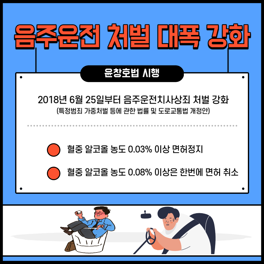 여러분은 윤창호법 다 아시죠? 2018년 6월 25일부터 ‘윤창호법’이 전면 시행됐습니다. 이 법은 음주운전치사상죄 처벌을 강화하는 내용을 담은 특정범죄 가중처벌 등에 관한 법률 및 도로교통법 개정안입니다.