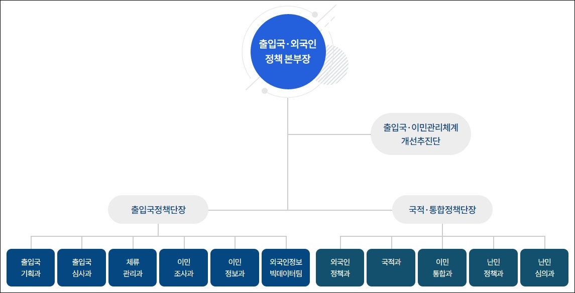 출입국·외국인정책본부 조직은 본부장 아래 출입국정책단장과 국적·통합정책단장을 두었는데요, 출입국정책단에는 출입국 기획과, 출입국 심사과, 체류 관리과, 이민조사과, 이민정보과, 외국인 정보 빅데이터팀 등이 있습니다. 국적·통합정책단에는 외국인 정책과, 국적과, 이민통합과, 난민정책과, 난민심의과 등이 있습니다.