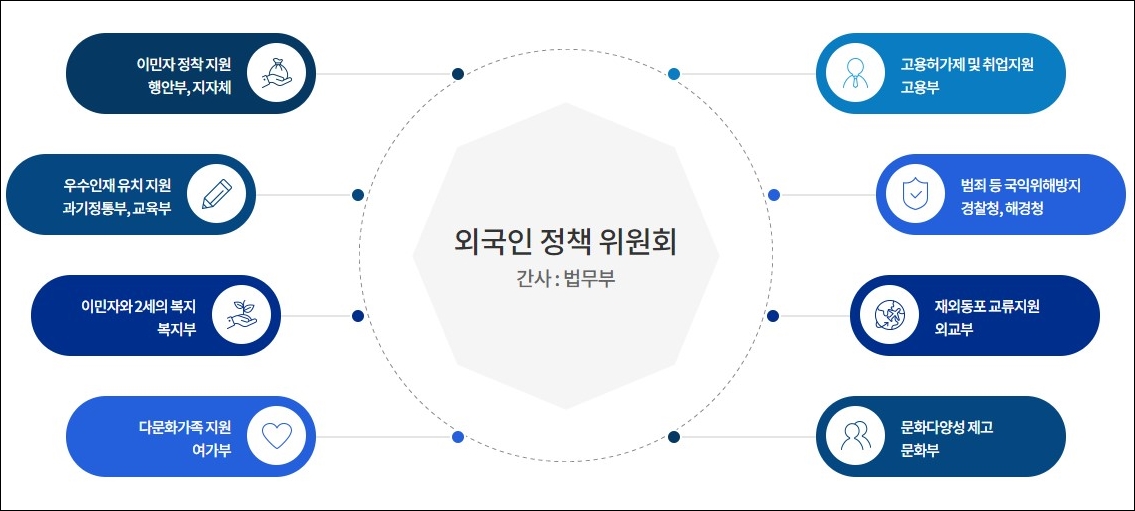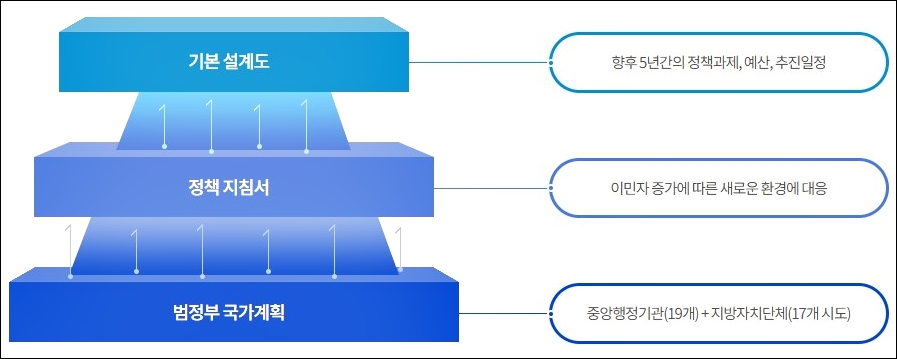 이런 국내외 상황을 반영하여 출입국·외국인정책본부는 「재한외국인 처우 기본법」에 따라 법무부장관이 5년마다 관계부처의 기본계획을 종합하여 「외국인정책기본계획」을 수립하여 발표하고 있습니다. 이민자 증가에 따른 새로운 환경에 대응하기 위한 지침서로 중앙행정기관(19개)과 지방자치단체(17개 시도) 등이 참여하여 범정부 국가계획을 수립합니다.